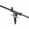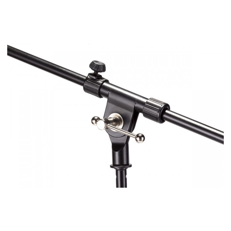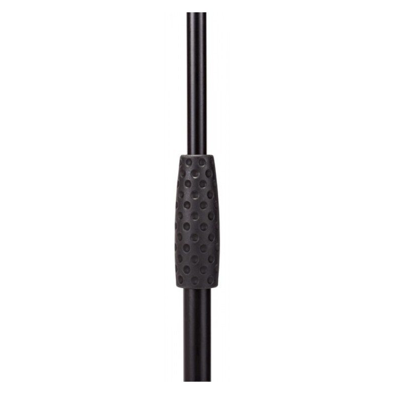 Asta professionale con giraffa per microfono. Dotata di base tripoide realizzata in alluminio pressofuso con inserti in nylon per i gambi. Snodo superiore di regolazione in acciaio con parti di scorrimento in nylon. Manicotto di regolazione dell'altezza e contrappeso, realizzati in nylon 'soft grip'. Disponibile nella finitura nero opaco.