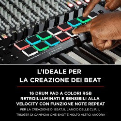 16 Pad RGB, retroilluminati, assegnabili, sensibili alla velocità con Note Repeat per la produzione di beat, il lancio di clip e altro