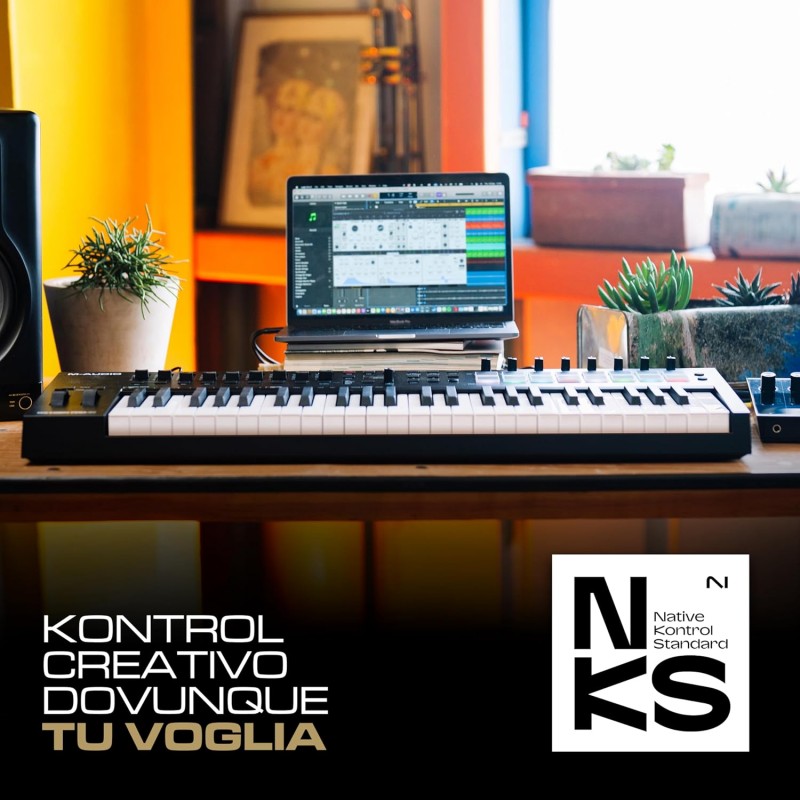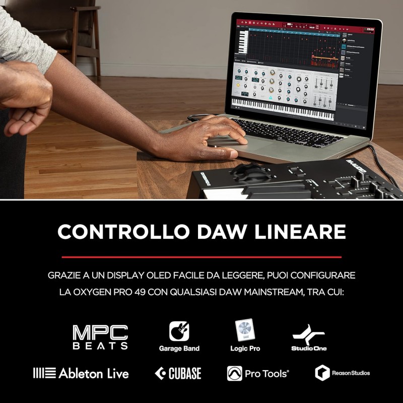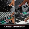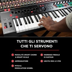 Oxygen Pro 49 è un potente controller MIDI alimentato tramite USB a 49 tasti che ti consente di creare la musica che desideri rendere ancora più semplice. I nuovi controller Oxygen Pro aprono mondi di espressione e creatività e rendono più semplice che mai dare vita alle tue idee di produzione. E' semplice utilizzare il controller Oxygen Pro 49 con qualsiasi DAW con i controlli mappati automaticamente dell'Oxygen Pro 49 come trasporto, fader, controlli canale (Record Arm, Solo, Mute e Select), controlli Pan e altro ancora. Sia che utilizzi Pro Tools, MPC Beats, Cubase, Logic, Studio One o qualsiasi altra DAW principale, seleziona semplicemente la mappa nell'elenco e Auto-Mapping si occuperà del resto. Inoltre, mappa istantaneamente tutti gli strumenti virtuali inclusi con Oxygen Pro 49 (Velvet, Mini Grand, Vacuum, Boom, DB33, Xpand! 2). Questi plugin Air Music Tech di prima classe possono essere controllati completamente da Oxygen Pro 49 e utilizzati in tempo reale mentre crei e mixi la tua musica. ConSmart Chordattivato, premendo un singolo tasto o pad verrà riprodotto un accordo completo anziché una sola nota. Il tasto o il pad che si preme determinerà la nota fondamentale dell'accordo. Il resto delle proprietà dell'accordo (maggiore, minore e intonazione - 1,3,5; 1,3,7; 1,3,5,7, etc) sono determinate dalle impostazioni scelte. Smart Chord dispone anche di una modalità personalizzata che consente di determinare la struttura degli accordi che verrà assegnata a ciascun tasto suonandolo manualmente. Oxygen Pro 49 dispone anche della tecnologiaSmart Scale. Con Smart Scale, è possibile impostare il key bed in modo che solo le note nella scala selezionata possano essere suonate. Ciò consente di suonare all'interno di una scala scelta senza il rischio di suonare note "sbagliate". Arpeggiatorl'Arpeggiatore incorporato influenzerà tutto ciò che stai suonando sui tasti da qualsiasi strumento virtuale nella tua DAW. Quando l'Arpeggiatore è attivato, la tastiera suonerà ripetutamente i tasti premuti in sequenza. Il tempo e il ritmo dell'arpeggiatore si basano sull'impostazione della divisione del tempo della tastiera e sull'impostazione del tempo della tastiera o del DAW. Ogni nota dell'arpeggio sarà la durata selezionata per l'impostazione della divisione temporale; ad esempio, se si seleziona 1/4, ciascuna nota dell'arpeggio sarà una nota da un quarto. Questo potente strumento può funzionare in modalità Latch o Momentary, rendendo facile liberare la tua creatività. Con un'ottimo feel in uno chassis leggero, il controller Oxygen Pro 49 offre un nuovo livello di ispirazione creativa. Il key bedPrecisionTouchdi M-Audio combina un'azione professionale semi-pesata con la tecnologia avanzata di scansione ad alta velocità del key bed per un'esperienza ultra espressiva. Questa tastiera personalizzata include anche Channel Aftertouch, che offre agli utenti maggiore espressione e controllo. Channel Aftertouch ti consente di influenzare il suono di un plug-in di strumento virtuale analizzando continuamente la pressione applicata a qualsiasi tasto dopo averlo premuto inizialmente. Ciò rende la creazione dell'atmosfera, delle dinamiche e delle emozioni che desideri trasmettere nella tua musica in modo naturale e veloce.