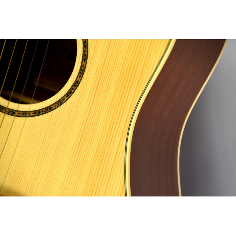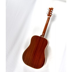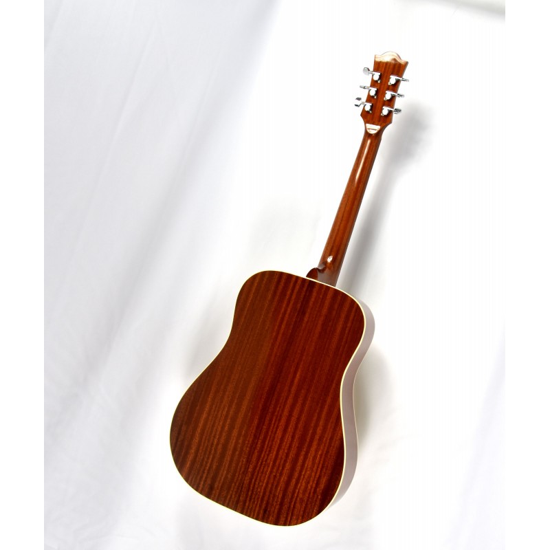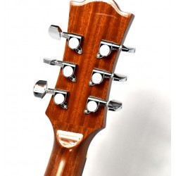 Chitarra acustica Eko. Tavola in legno massello di abete, fasce, fondo, manico e paletta in mogano, tastiera in palissandro a 20 tasti. Meccaniche die cast cromate.