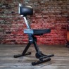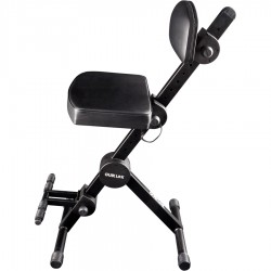Sgabello per musicisti con seduta, schienale e poggiapiedi regolabili in altezza con estrema facilità ed agilità, tirando la manopola blu e spingendo in alto o in basso la parte da regolare. |