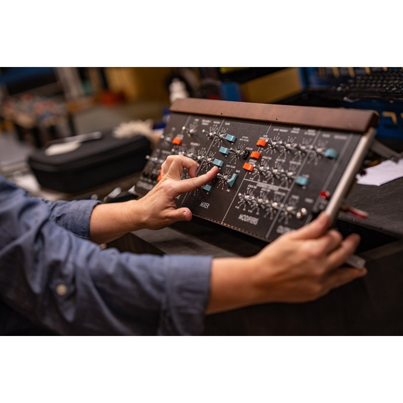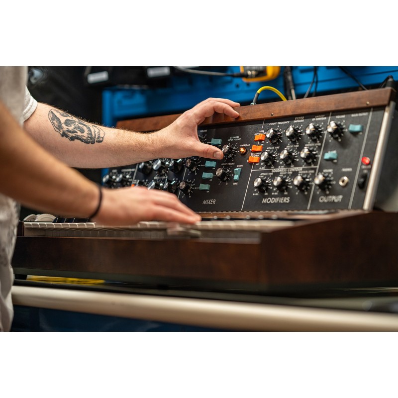 A più di mezzo secolo dalla sua invenzione, il Minimoog Model D è tornato in produzione nello stabilimento Moog di Asheville, nel North Carolina. Uno strumento sonoro eccezionale e uno dei sintetizzatori più amati e iconici mai progettati, ritorna nelle mani di sintetisti di ogni tipo e funge da ispirazione per la prossima generazione di musicisti elettronici. Sebbene non siano state apportate modifiche al motore sonoro originale o al percorso del segnale audio, il Minimoog Model D 2022 include una serie di popolari modifiche funzionali che espandono le capacità sonore di questo leggendario strumento. Queste modifiche includono un LFO analogico dedicato con forme d'onda triangolari e quadrate, una tastiera Fatar premium con velocità e after pressure disponibili tramite jack CV sul pannello superiore con trimpot integrati, integrazione MIDI e una modifica del feedback del mixer che consente di portare in overdrive Minimoog Model D ruotando una manopola. E, per la prima volta nella sua storia, il Minimoog Model D è ora dotato di una pirch wheel a molla con banda morta centrale, che consente una migliore suonabilità e prestazioni selvagge. Questa nuova edizione include anche aggiornamenti alla funzionalità MIDI, consentendo una migliore integrazione con i moderni studi. Utilizzando l'integrazione MIDI per le riedizioni del 2016 e del 2022 e convertitori da MIDI a CV per le unità vintage coinvolte in questa performance, il Moog Ensemble evidenzia le caratteristiche moderne accanto al suono classico. Secondo il direttore musicale e compositore del gruppo, Will Gregory, i miglioramenti dello strumento espandono il regno delle possibilità sonore del modello D. A causa della complessità del processo costruttivo è possibile produrre solo un limitato quantitativo di unità al mese e i tempi di attesa per entrare in possesso di questo richiestissimo synth potrebbero essere piuttosto lunghi. |